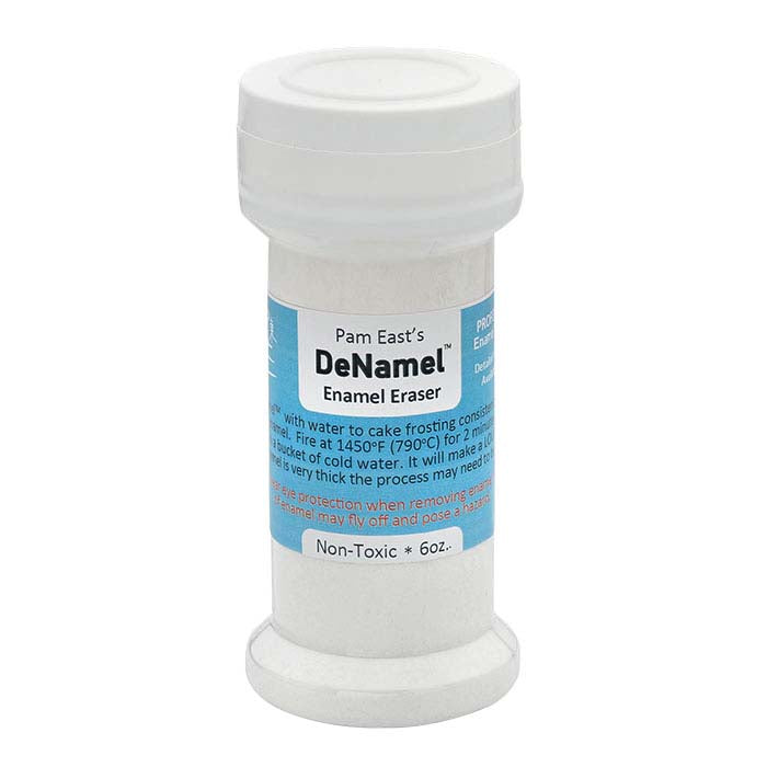 Formulated by Pam East, this powder effectively removes enamel from your fired metal pieces. Mix a small amount of water into a spoonful of DeNamel™ to the consistency of cake frosting, and spread it on the enamel. If the piece has counter-enamel on the back side, treat each side separately, removing the enamel from one side and then repeating the procedure on the other side. When heated in a kiln and quenched in water, the enamel cracks off of the metal with an audible, spectacular "pop"—eye protection is a must during this procedure, as bits of enamel fly off while you're working.
