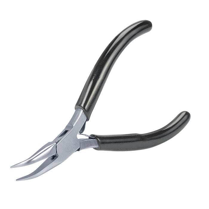 These slim bent chain-nose pliers are suitable for a variety of bench and wire-wrapping tasks; its smaller size and slender profile make it ideal for fine work and delicate tasks. On chain-nose pliers, both jaws are semi-round with flat interior surfaces, tapering to a point from the pivot to the tip. The jaw tips of these pliers are bent perpendicular to the joint, enhancing reach and visibility. The smooth finish on the interior surface of the jaws helps reduce the risk of marring delicate pieces. Use to open and close jump rings, for flat crimping and to make angled bends.
