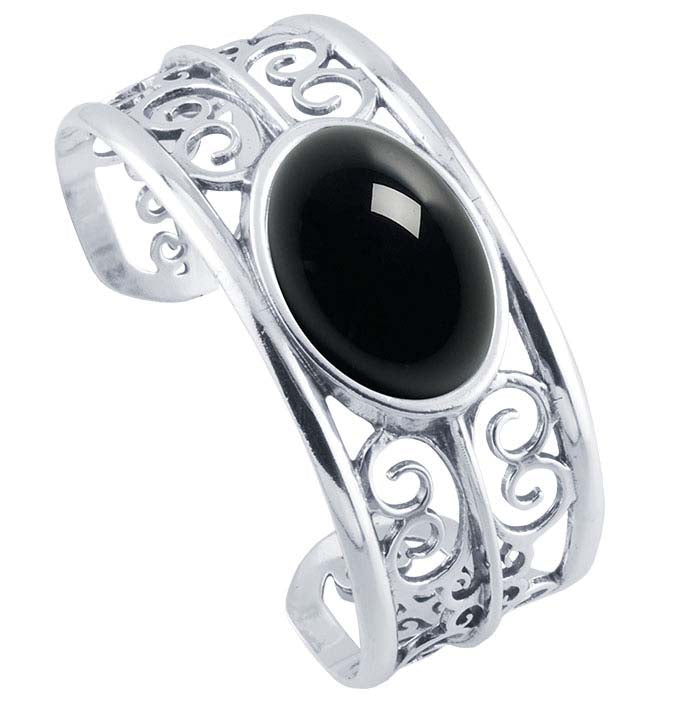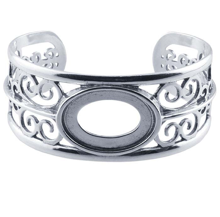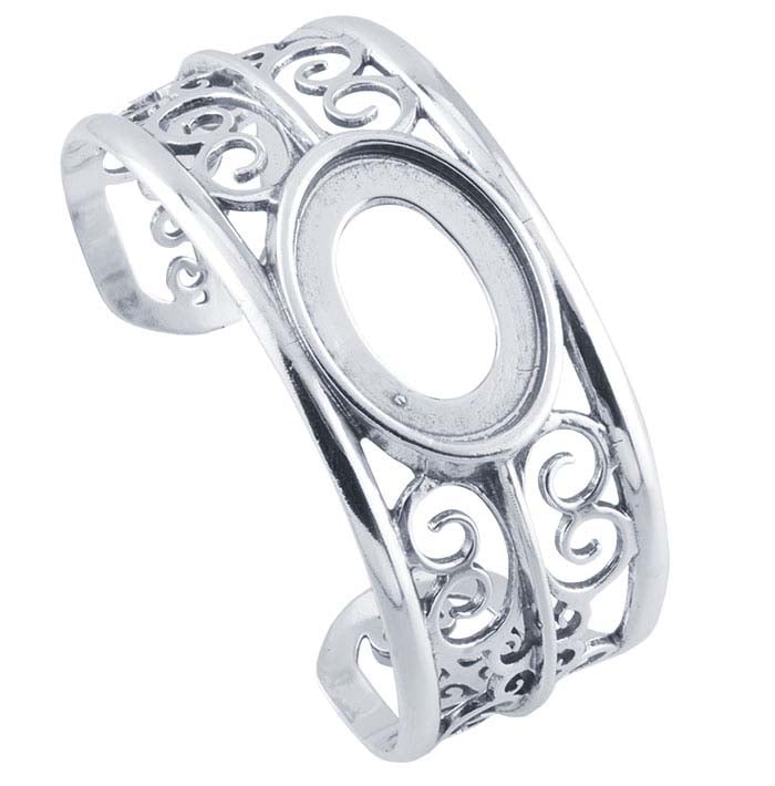 This bold sterling silver cuff bracelet features a swirling, filigree-style pattern and a 25 x 18mm oval bezel mounting, ideal for finishing with your customer’s choice of stone or other embellishment. Set a cabochon or cameo into the bezel, and use jeweler’s epoxy to secure the stone in place.