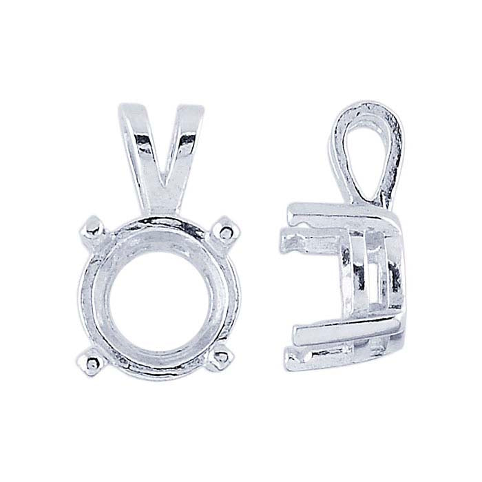 This sterling silver Legendary™ pendant mounting features a tapered rabbit-ear bail and a pre-notched 4-prong basket mounting that holds one 8mm round faceted gemstone. Basket settings feature open sides designed to allow more light to reach and move through the stone, enhancing its brightness and brilliance.