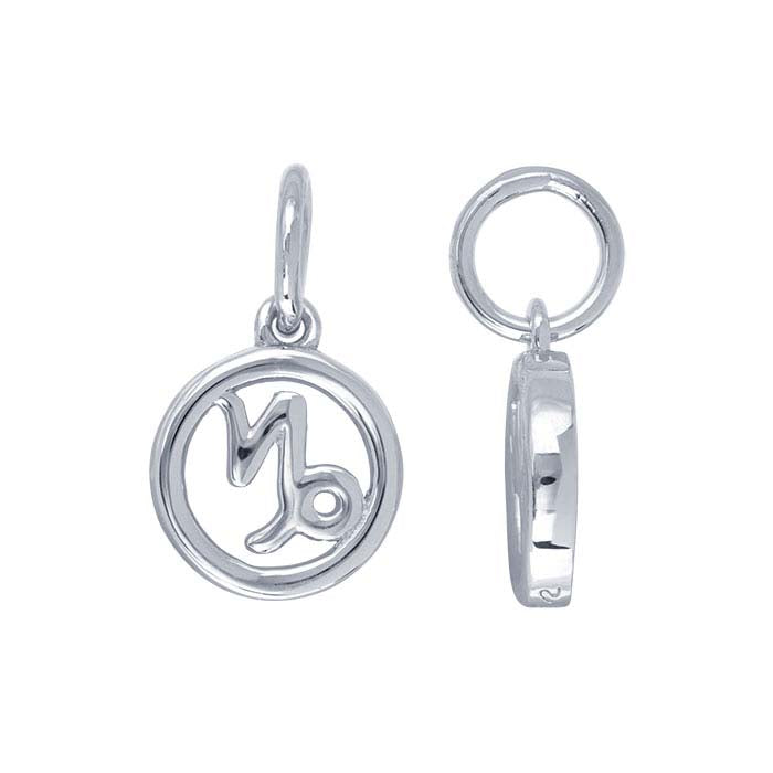 This sterling silver zodiac charm features a round shape with a Capricorn symbol in the center. Create an earring drop or combine it with other charms and components in more complex necklace, bracelet and anklet designs. This charm includes a jump ring.