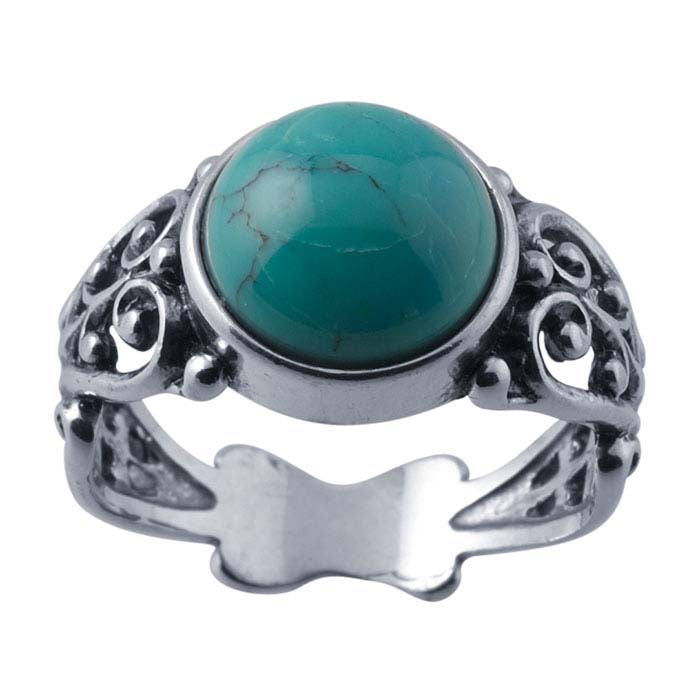 This sterling silver ring mounting features an open filigree design and a bezel mounting that holds one 10mm round cabochon. It features a sizing bar that makes it easy to size the ring without disrupting the filigree design. A wide rim inside the walls supports the stone and reduces metal weight, making the mounting more affordable. Use jeweler's epoxy to secure the stone in the mounting.