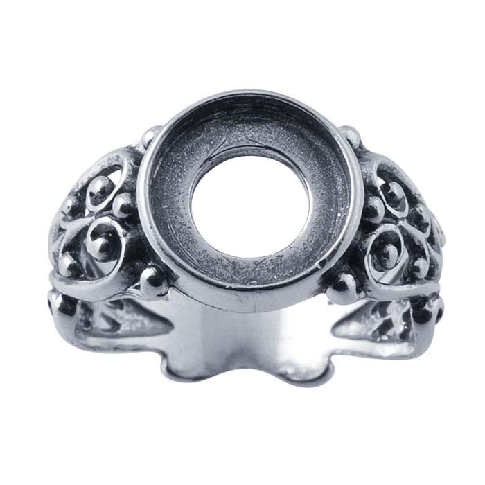 This sterling silver ring mounting features an open filigree design and a bezel mounting that holds one 10mm round cabochon. It features a sizing bar that makes it easy to size the ring without disrupting the filigree design. A wide rim inside the walls supports the stone and reduces metal weight, making the mounting more affordable. Use jeweler's epoxy to secure the stone in the mounting.