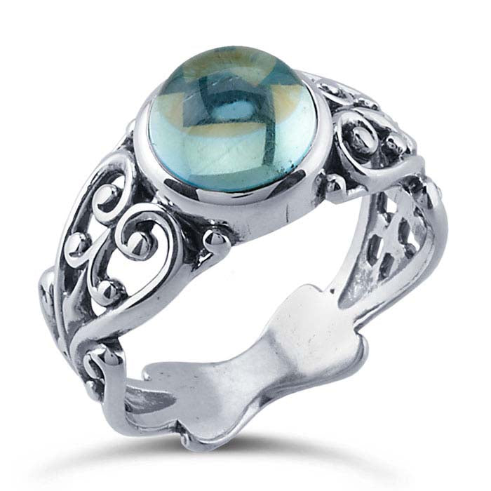 This sterling silver ring mounting features an open filigree design and a bezel mounting that holds one round 7mm flat-back gemstone or crystal. It features a sizing bar that makes it easy to size the ring without disrupting the filigree design. A wide rim inside the walls supports the stone and reduces metal weight, making the mounting more affordable. Use traditional bezel-setting techniques to secure the cabochon in the mounting. Place your stone in the bezel and push the walls inward over the stone, holding it in place. For added security, if desired, place a drop or two of jeweler's epoxy along the rim before placing the stone.
