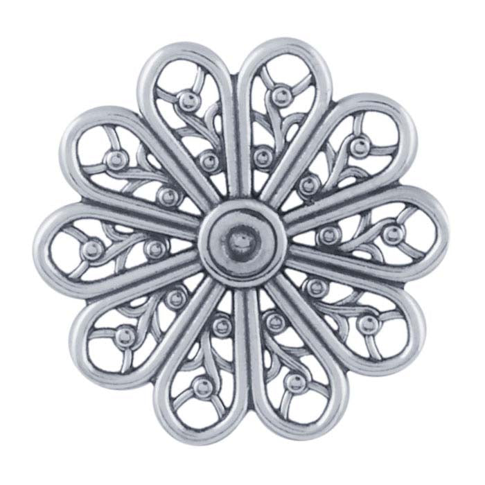 This sterling silver component features an open filigree-style flower with dense, layered details. Add a jump ring to create a pendant or earring drop, or combine it with other drops, dangles and charms in more complex necklace and bracelet designs. The component is oxidized to enhance the details.