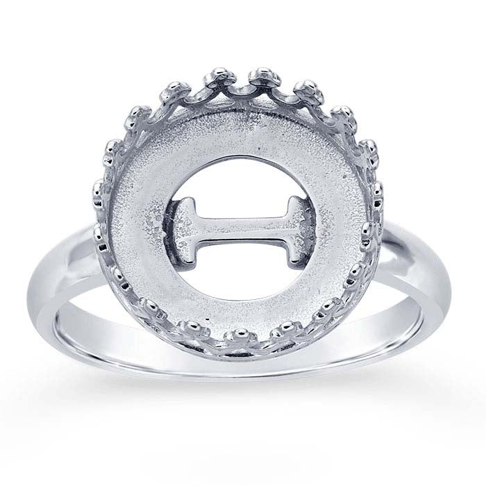 This sterling silver ring mounting features a bezel mounting with walls modeled from decorative gallery wire. The mounting holds one 12mm round cabochon or other flat-back stone. A wide rim inside the walls supports the stone and reduces metal weight, making the ring more affordable. Use traditional bezel-setting techniques to secure the cabochon in the mounting. Place your stone in the bezel and push the walls inward over the stone, holding it in place. For added security, if desired, place a drop or two of jeweler's epoxy along the rim before placing the stone.