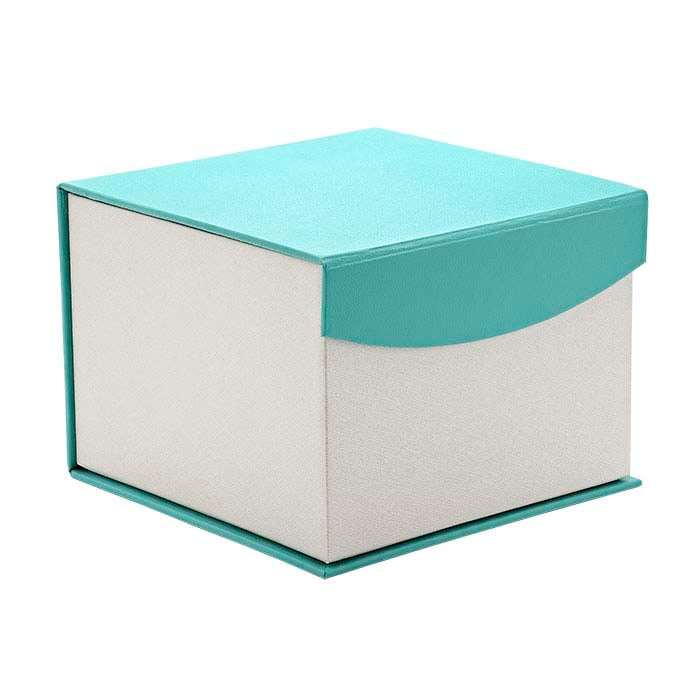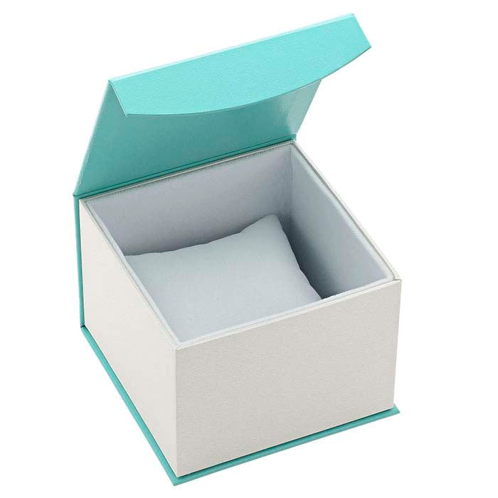 This white and teal paper-covered gift box accommodates one bracelet or watch. The attractive color combination and curved-front, magnetic flap closure give the box an eye-catching, high-end look. A pillow insert supports the bracelet or watch; use the pillow as a display, then simply insert it in the box for your customer to take home. Add a decorative ribbon, gift wrapping or bow (available separately) to customize the box. Smooth, semi-glossy teal-blue paper covers the top and bottom of the box; the sides are covered with pearly white linen-textured paper. White paper covers the inside of the lid; white flocking lines the interior sides of the box and the foam insert.