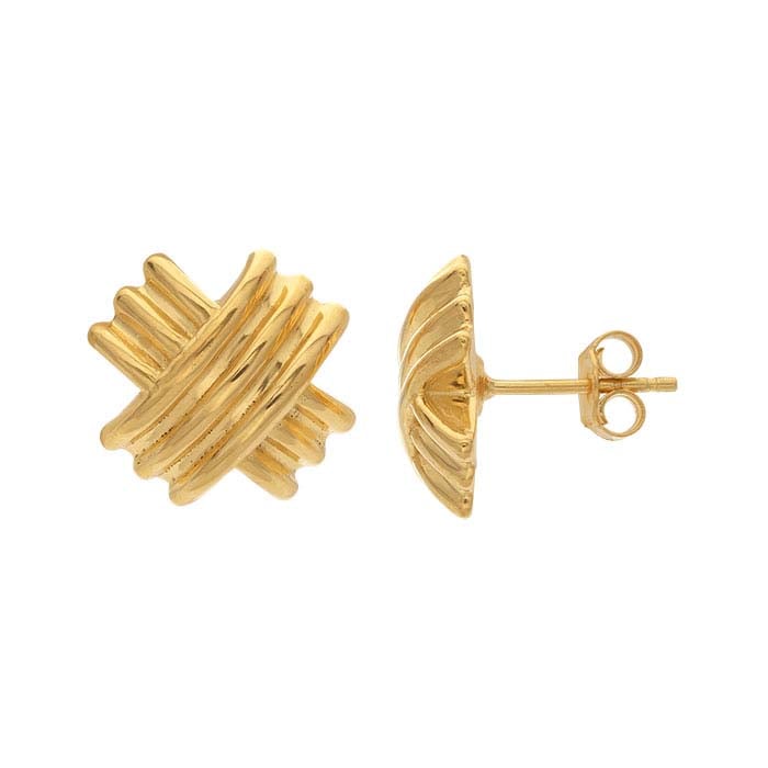 This electroformed 14-karat yellow gold post earrings feature a curved X design with a bright finish that delivers an eye-catching look. During the electroforming process, the substrate dissolves, producing a durable hollow piece that reduces cost and is comfortable to wear. The post features two grooves, allowing customers to customize the fit of their earring.