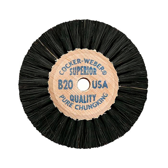 From Cocker-Weber®, renowned for superior jeweler's brushes since 1892, this Chungking dental bristle brush is densely packed for optimum brush surface and precisely proportioned to hold a consistent shape even after lengthy use. Bristles are securely set into hard maple hubs. Stiffness is determined by both the number of rows and the bristle trim length.