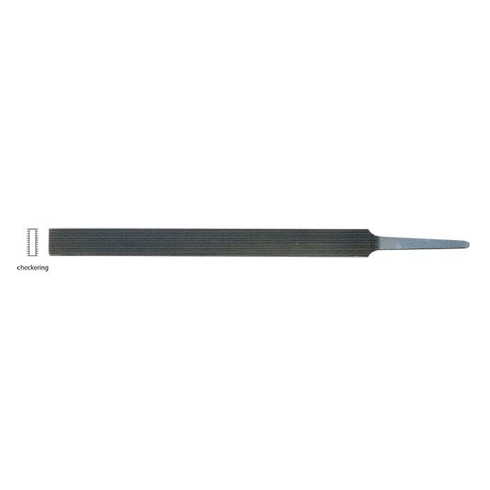 This Friedrich Dick checkering hand file, also called a texturing file, is ideal for cutting decorative serrations on bezel edges, for creating florentine-style finishes, and for checkering—cutting long, parallel lines, then cutting criss-crossing lines at angles up to 90° to form a diamond-like pattern in the metal. It features teeth arranged in parallel lines along the length of the file on the top and bottom surfaces. The edges are smooth, preventing marring or metal removal from surfaces adjacent to the work area.This file has a German cut #0; German-cut files are graded by the number of teeth, counting teeth parallel to the long axis of the file. German cuts start coarser than Swiss and go finer, offering more increments for more precise cutting. In all cut styles, the higher the number, the finer its cut.Hand files, also called 'full-size' files, feature a larger cutting surface that is longer and wider than other file types and are ideal for fast, efficient removal of material from the workpiece for initial shaping, for smoothing and, in finer cuts, for finishing. These files have a narrow, tapered tang intended to be secured into a handle (available separately) that provides comfort and control of the file when in use.Among the finest jewelers' files in the world, Friedrich Dick files are made of tough chrome/tool steel alloy and precisely machined to yield sharp corners and fine points. These files have deep-cut teeth that provide efficient, uniform stock removal; they are 66–67 HRC hardness for exceptional service with minimal care.