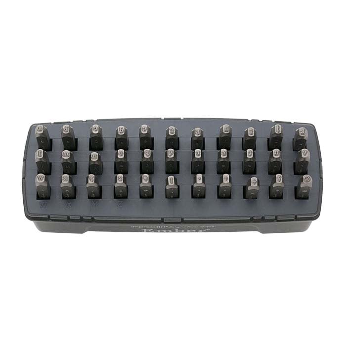 Quickly add decorative lettering or custom phrases to your jewelry designs with this ImpressArt® alphabet design stamp set. These stamps have straight shanks and are perfect for marking flat surfaces such as quality or brand tags, discs, stampings and other components. Each stamp is labeled on its side for easy identification and orientation. This set includes the complete alphabet (A–Z) plus seven additional shapes and comes in a slotted case (6-3/4"W x 2-1/2"D x 3-1/4"H) with clear lid for easy, organized storage.ImpressArt® stamps are cut from hardened steel and tested for Rockwell hardness and perfect alignment. They are great for stamping soft metals including brass, copper, nickel silver, gold, silver and aluminum. Stamps with a straight shank have a flat tip face that's perpendicular to the tool shank. Designed to work perfectly with the specially made Ergo-Angle™ stamping hammer and Simple Strike Jig™ (each available separately), these stamps are durable, providing consistent metal-stamping success when creating custom, personalized jewelry items.For best results—and because any stamped mark is not easy to remove once it's made—it's important to practice before attempting to mark your jewelry designs. Scrap pieces of sheet or flat base metal components are ideal for helping you get the feel of both the stamp and the power needed for an effective hammer strike. Use a brass mallet to strike the stamp to help prevent damage to your stamp, and support your workpiece on a bench block or an anvil. Finally, do your stamping before setting stones so that there is no risk of damaging settings or loosening set stones.