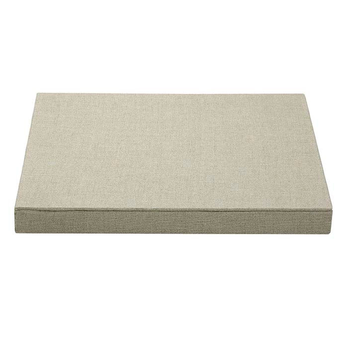 Use this linen riser to elevate selected pieces or stands, providing visual variation in a display of similarly sized jewelry pieces. The additional height draws attention and gives texture to larger or more complex display arrangements. The flat, rectangular shape of this riser makes it useful as a case-top display; move individual pieces from inside the case to the riser for a customer’s closer inspection. The natural, undyed linen fabric has a subtle texture and a visible weave that makes it an attractive backdrop for any style of jewelry. Natural linen, untreated by chemicals, covers a cardboard and polystyrene form.