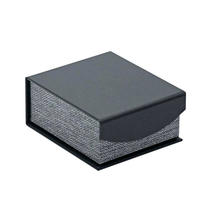 This "Silver Night" gray and black gift box accommodates one pendant or pair of earrings, making it ideal for matched sets. The subtle, two-tone color scheme and curved-front, magnetic flap closure give the box an eye-catching, high-end look. Add a decorative ribbon, gift wrapping or bow (available separately) to customize the box. Smooth, black paper with a faux-leather look and feel covers the top and bottom of the box; the sides are covered with gray pebbled paper with a metallic sheen. Black paper covers the inside of the lid; black velvet lines the interior sides of the box. Black suede covers foam insert.Hot stamp or custom print the box with your company name or logo, keeping you top-of-mind long after the jewelry sale.