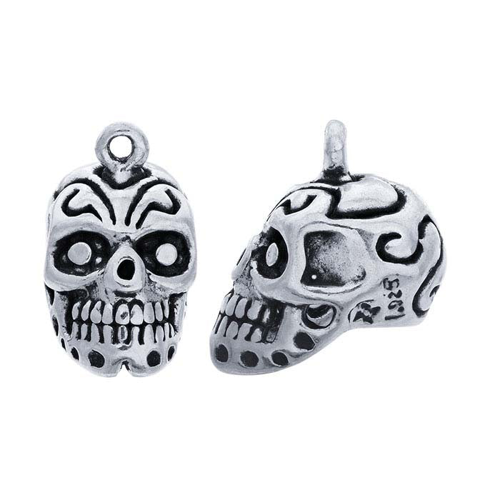 This sterling silver charm features a 3D sugar skull with oxidized details. The skull is hollow, making it lightweight; it is ideal for an earring drop and looks great when combined with an assortment of charms and beads in more complex designs. A closed ring is included.