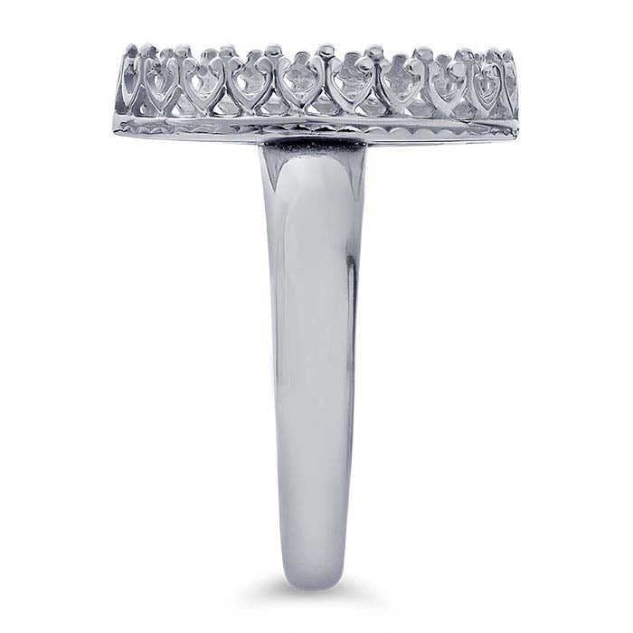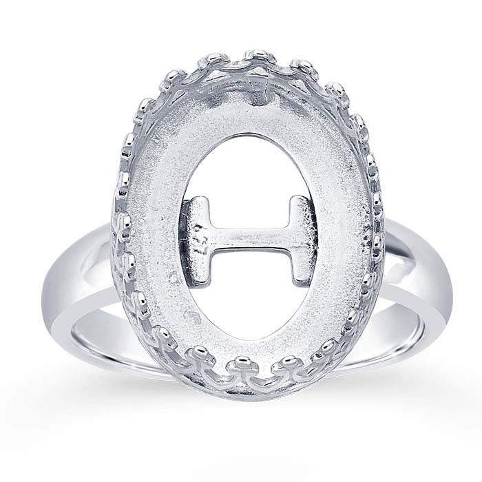 This sterling silver ring mounting features a bezel mounting with walls modeled from decorative gallery wire. The mounting holds a 16 x 12mm oval cabochon or other flat-back stone. A wide rim inside the walls supports the stone and reduces metal weight, making the ring more affordable. Use traditional bezel-setting techniques to secure the cabochon in the mounting. Place your stone in the bezel and push the walls inward over the stone, holding it in place. For added security, if desired, place a drop or two of jeweler's epoxy along the rim before placing the stone.