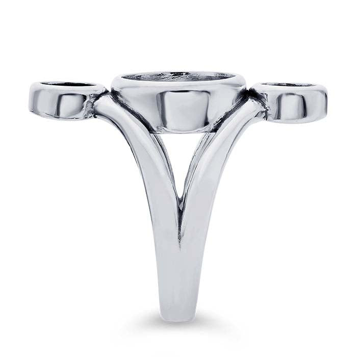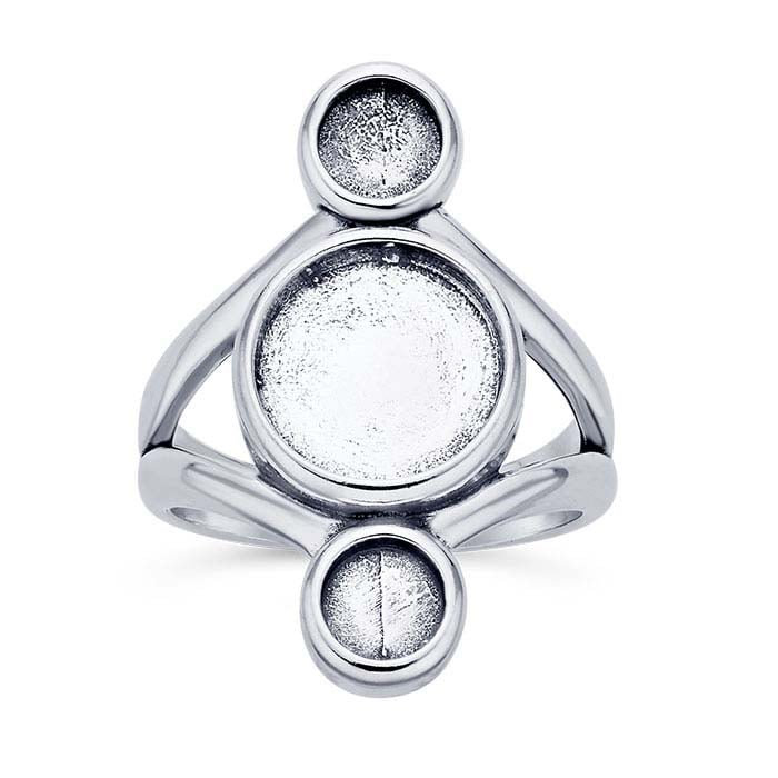 Set this this sterling silver ring mounting with three cabochons or other flat back stones to create custom looks. It features a split shank design that is connected by two round 5mm and one 10mm mountings. Use jeweler's epoxy to secure a stone into each bezel.