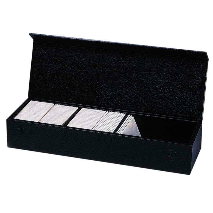 This organizer box provides an attractive and economical option for storing or transporting stone papers by keeping them secure and easily accessible. Two removable dividers and a hook & loop fabric closure keeps the papers in place. Black paper covers the cardboard box.