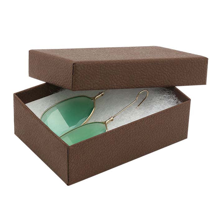 This paper-covered, two-part universal box accommodates a variety of jewelry styles. Use the box as-is, or mix & match it with solid-color cardboard boxes to create color combinations to suit your brand, for seasonal packaging, or for special occasions. Add a decorative ribbon, gift wrapping, or bow (available separately) to customize each box. Coffee shop cocoa-color recycled paper (100% post-consumer fiber) covers the 100% recycled cardboard box (made with 90% post-consumer fiber and 10% pre-consumer fiber); the box includes a 1/2"-thick white poly-fill wadding that will not cause tarnish.Hot stamp your gift box with your company name or logo, keeping you top-of-mind long after the jewelry sale.