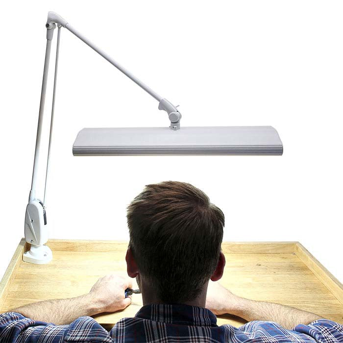 This premium-quality metal lamp provides a fully adjustable 43" floating arm for convenient, precise positioning. The exterior of the lamp is powder-coated for durability and long service life. The universal clamp–on base has a 2" opening and clamps onto any vertical, horizontal or slanted surface; it can also be mounted to any horizontal surface. The lamp is delivered with three standard cool-white (6500K) 15-watt, 18" fluorescent tube bulbs and a 7-ft. cord with a three–prong grounded plug. UL approved. Lamp includes a manufacturer's two-year electrical warranty and five year mechanical warranty.