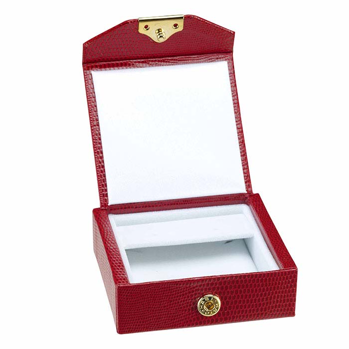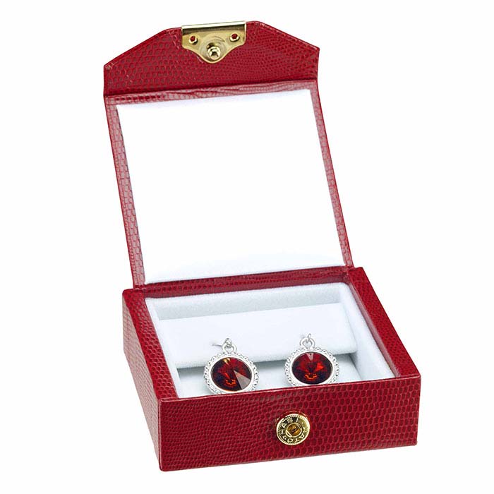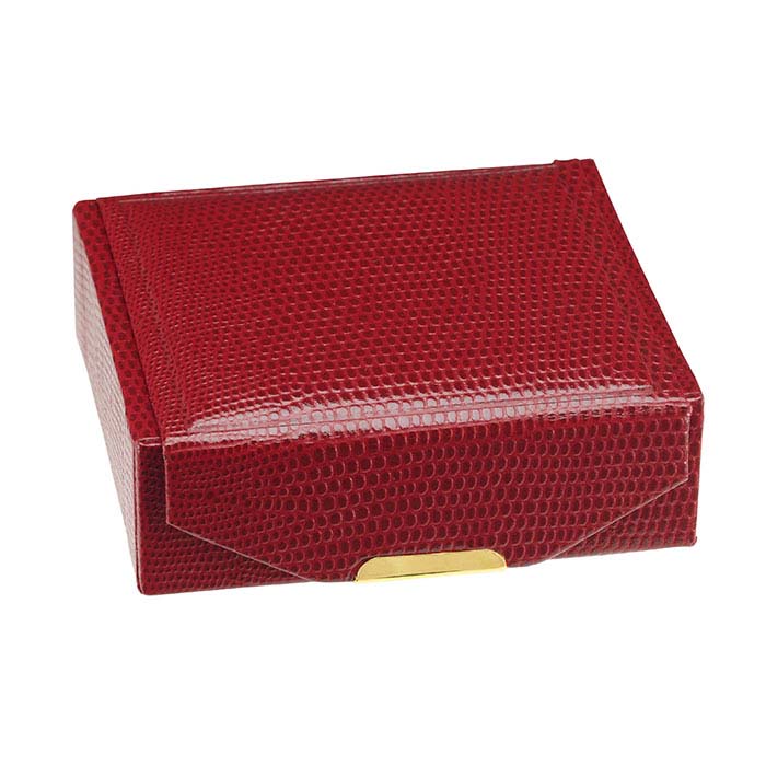 This High Desert™ faux-leather combination box accommodates a small pendant and/or pair of earrings, making it ideal for coordinated sets. Add a decorative ribbon, gift wrapping or bow (available separately) to customize the box. Red, faux-leather Skivertex® material with a genuine snakeskin leather look and feel covers the sturdy cardboard box; white satin lines the box lid; matching-color velvety fabric covers the cardboard insert. A gold-color metal snap secures the box. Each box is delivered in a protective cardboard sleeve.