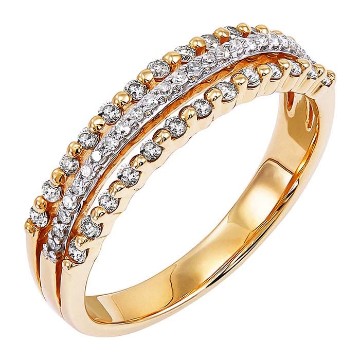 This 10-karat yellow gold wedding band style ring is set with several round white diamonds (I3 clarity/G–I color; 1/3CTTW) in three rows. It’s a great addition to almost any engagement ring style and makes an ideal choice for an anniversary ring.