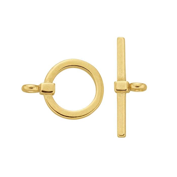 This 14-karat yellow gold toggle clasp features a square profile and provides a secure closure for bracelet and necklace designs. It is durable yet lightweight and pairs well with beaded and fabricated bracelets and necklaces made with yellow-gold components. A toggle clasp is a two-part clasp consisting of a ring and a bar. The bar end requires a short length of chain to allow it to slide lengthwise through the ring, then turn sideways so that it cannot fit back through the ring, effectively closing the jewelry piece. To open, the bar is simply pulled further through the ring just far enough to allow it to turn lengthwise again and slide back through the ring.