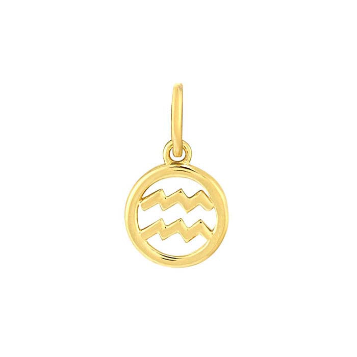 This 14-karat yellow gold zodiac charm features a round shape with an Aquarius symbol in the center. Create an earring drop or combine it with other charms and components in more complex necklace, bracelet and anklet designs. This charm includes a jump ring.