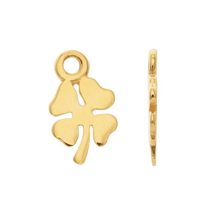 This small 14-karat yellow gold clover charm features a smooth, flat surface and an attached ring so it will hang at a slight angle. Use this charm as a drop for an earring, in clusters as part of a larger design or as a jewelry tag in a finished piece.