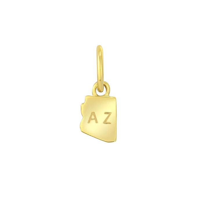 This flat 14-karat yellow gold charm, shaped like the state of Arizona, features the two-letter abbreviation on one side. It is an ideal choice as an earring drop, bracelet charm, or as part of a layered necklace or bracelet design.