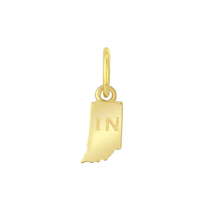 This flat 14-karat yellow gold charm, shaped like the state of Indiana, features the two-letter abbreviation on one side. It is an ideal choice as an earring drop, bracelet charm, or as part of a layered necklace or bracelet design.