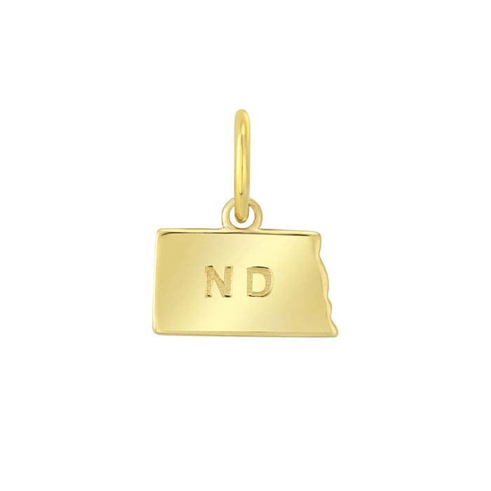 This flat 14-karat yellow gold charm, shaped like the state of North Dakota, features the two-letter abbreviation on one side. It is an ideal choice as an earring drop, bracelet charm, or as part of a layered necklace or bracelet design.