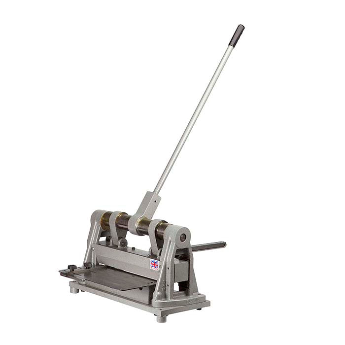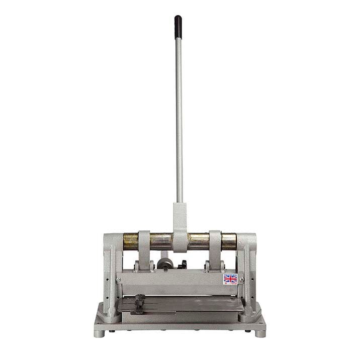 Manufactured in England by Durston, this guillotine shear allows you to achieve straight, even cuts on metal up to 300mm (11.75”) wide. The precision-ground hardened and tempered cutting blade cuts non-ferrous metal up to 3.5mm thick (8 gauge) and mild steel up to 2mm thick (12 gauge). The blade can be turned up to four times before it needs sharpening and is perpendicular to the hand bar for an unobstructed view of the cutting path. An extra-long hand bar gives added leverage that makes cutting almost effortless.