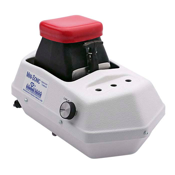 The MT-4 Mini-Sonic tumbler operates with no moving parts—no shafts, belts, pulleys, spinning weight or even a motor—no parts to maintain, wear out or replace. This tumbler converts electric current into vibrations (more than 3,500 vibrations/minute) that power the rotation of the load. The intensity of the vibration is adjustable using solid state electronic controls. While parts tumble, they are alternately separated and pushed together; this cycling allows fresh abrasive to be drawn into and among the jewelry pieces yet leaves the hopper itself practically motionless on your work surface. Compared to other tumblers, the Mini-Sonic requires only a small amount of abrasives; the abrasive breaks down and combines with the water, forming a slurry that is extremely effective.
