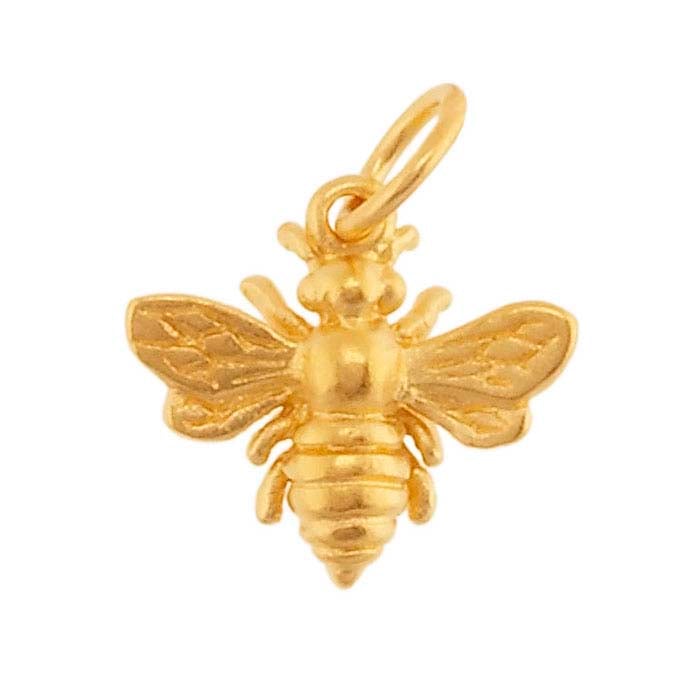 Add a touch of nature to your designs with this three-dimensional heavily gold-plated sterling silver honey bee charm. Use it alone for an eye-catching earring drop or combine it with other charms and components to create more complex, themed necklace and bracelet designs. The charm allows you to offer your customers both the beauty of 24-karat gold and the value of precious metal at a very affordable price. This satin-finish piece is made of sterling silver and heavily plated with a 1-micron thick (40 millionths of an inch) layer of pure 24-karat gold—a far more substantial layer than traditional plating. An attach ring is included, making it easy to add to any bracelet or necklace made with cord or chain.