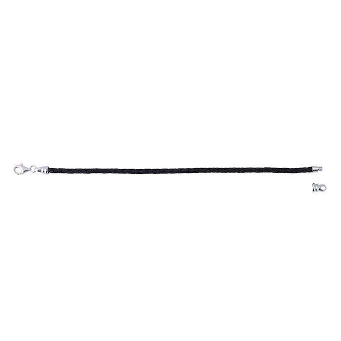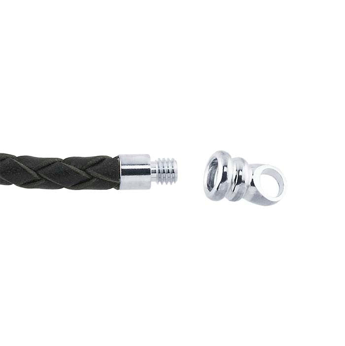 Give your customers the freedom to create a personalized design with this braided, black leather cord bracelet that makes interchanging beads and charms a snap. The easy-on/easy-off threaded end cap allows customers to add or remove beads or charms quickly and easily. Encourage your customers to create their own design by offering a variety of beads with holes larger than 3.8mm to fit over the threaded end of the clasp. It's ideal for large-hole beads. The end caps and clasp are sterling silver.