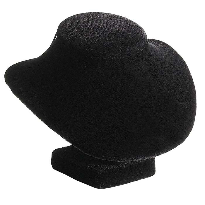 This black faux leather necklace bust holds necklaces, pendants and chains of any lengths; its height makes it a great choice for showcases and in areas with limited space. The classic black velvet is an ideal complement to a wide variety of jewelry designs, including monochromatic metals and brightly colored beaded and strung designs. The low-profile bust shows how a necklace or pendant will look when worn without taking up vertical space. Two tabs and a mounted eyelet on the back of the form secures the necklace at the optimal length and holds excess chain. Plush black velvet covers padded wood and cardboard.