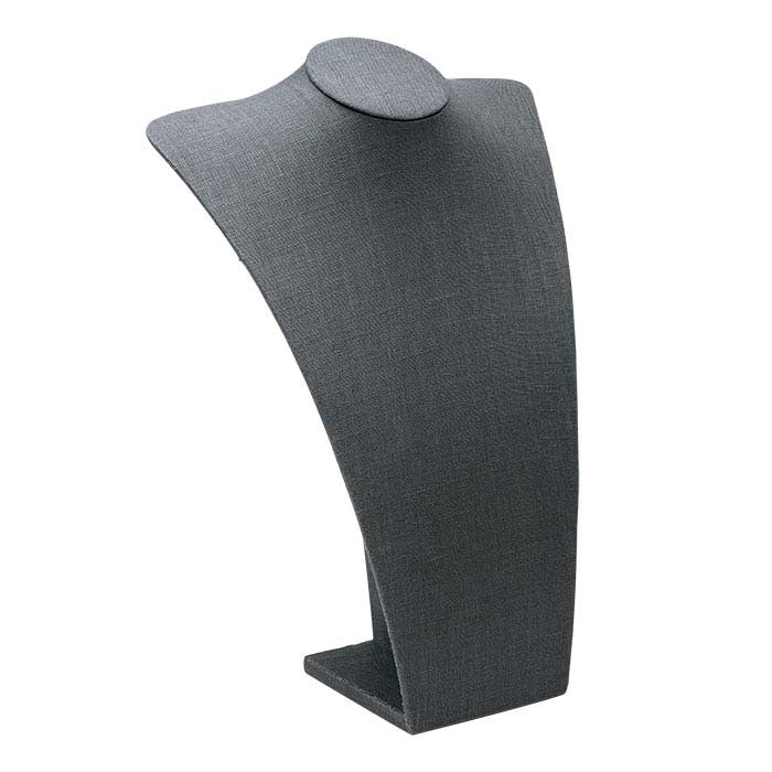 This necklace bust, covered in dyed linen, is ideal for showing off a single necklace or multiple necklaces of varying lengths; the slender, elongated profile of the bust gives it a modern, elegant look. Use the bust as a single standing element in your display, or pair it with busts of varying heights. The simple contours and vertical orientation of this bust let the necklace or pendant hang with a natural drape, as it would when worn. The gray linen offers a sophisticated dark color with a subtle natural texture that helps keep the jewelry from sliding out of place. Two wire tabs on the back secure excess chain, allowing you to display your necklace at any length like and keep the display neat and elegant. Dyed dark-gray linen covers the padded wood and cardboard form.