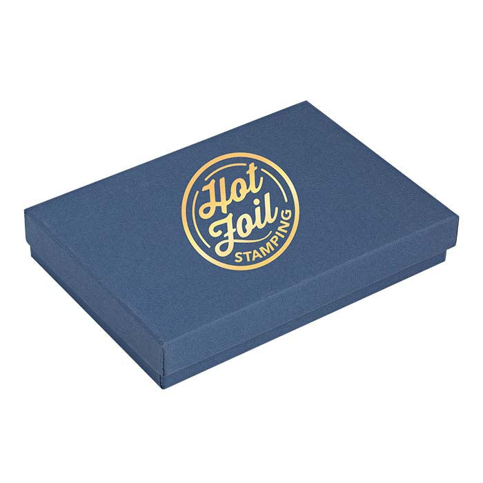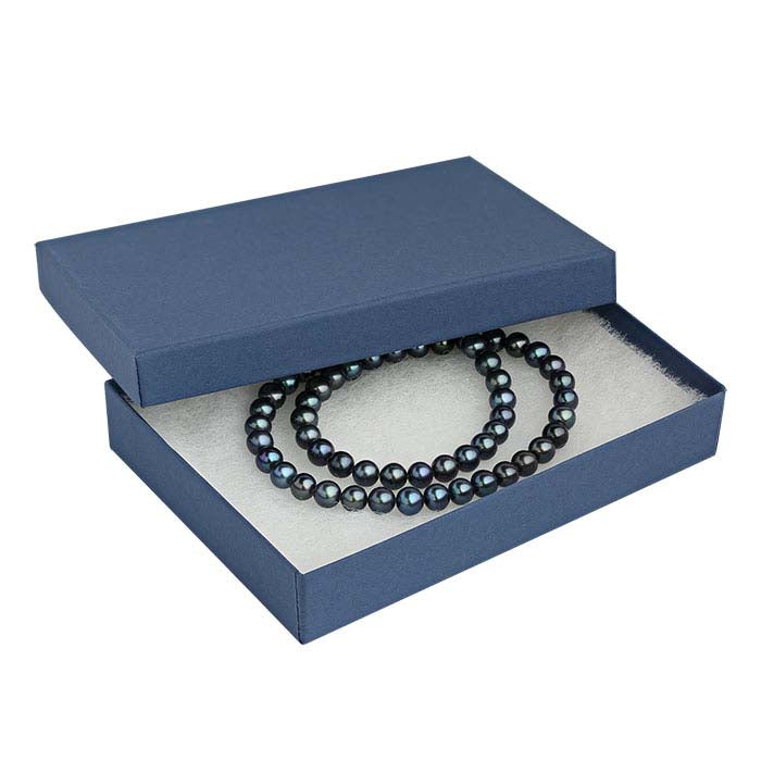 This paper-covered, two-part universal box accommodates a variety of jewelry styles. Use the box as-is, or mix & match it with solid-color cardboard boxes to create color combinations to suit your brand, for seasonal packaging, or for special occasions. Add a decorative ribbon, gift wrapping, or bow (available separately) to customize each box. Navy blue recycled paper (100% post-consumer fiber) covers the 100% recycled cardboard box (made with 90% post-consumer fiber and 10% pre-consumer fiber); the box includes a 1/2"-thick white poly-fill wadding that will not cause tarnish.Hot stamp your gift box with your company name or logo, keeping you top-of-mind long after the jewelry sale.