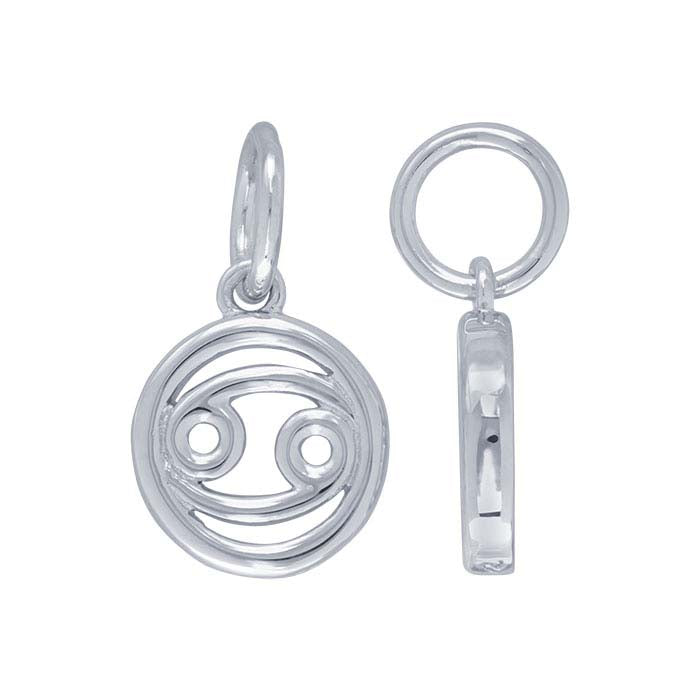 This sterling silver zodiac charm features a round shape with a Cancer symbol in the center. Create an earring drop or combine it with other charms and components in more complex necklace, bracelet and anklet designs. This charm includes a jump ring.