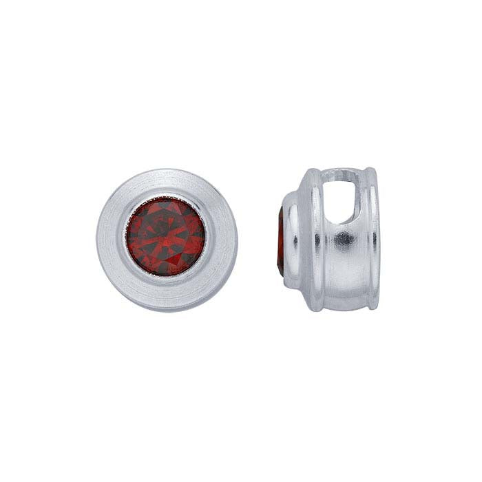 This sterling silver charm is set with one 4mm round, dark-red faceted crystal; garnet is the birthstone for January. The charm features two openings that make it easy to add to a chain or cord.