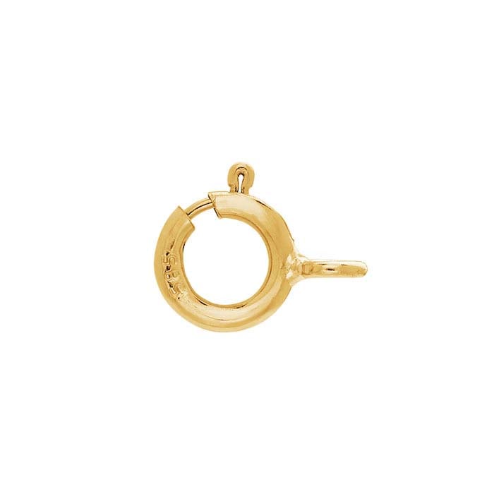 This 14-karat yellow gold spring ring clasp features a closed ring to help you complete your design. A classic clasp, the spring ring is ideal for all but the heaviest of necklaces. A spring ring is simply a hollow ring with an opening in one side that is closed off by a sliding 'door' inside the hollow ring. The door is held in place by a tiny spring controlled by a tiny nib on the outside of the ring. Press the nib back to compress the spring and open the clasp; release it to close the clasp.
