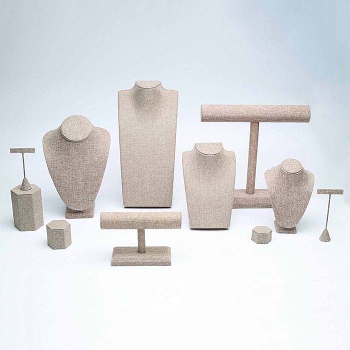 This necklace bust is ideal for spotlighting necklaces of any length and size; the texture and visible weave of the natural burlap surface make it especially suited to bold designs and large multi-strand pieces. The bust shows necklaces and pendants with a natural drape, so customers can see how the jewelry will look when worn. Two hooks on the back of the secure excess chain, allowing you to neatly adjust the pendant to the perfect length, offering an elegant presentation. Natural burlap covers padded wood and cardboard.