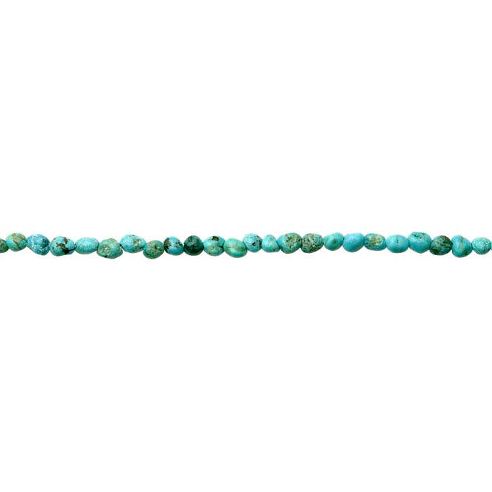 The irregularly shaped Chinese turquoise nugget beads on this strand feature a sky-blue to greenish color with a dark matrix—each bead has a varying amount of matrix, giving the strand a one-of-a-kind look. The nuggets look great when strung on their own in a necklace or bracelet, used individually as accent beads or when combined with complementary-color beads in necklace, earring and bracelet designs—turquoise looks especially good with silver beads and findings. Sourced from China, this turquoise features green/blue color and displays quite a bit of matrix, which gives each stone significant contrast and unique patterning.Turquoise is a soft, opaque gemstone that takes a good polish. Its sky blue color comes from the presence of copper; green tones are provided by iron traces. Turquoise sometimes has a rock matrix and varying shades of gray, brown or black veining due to inclusions or oxide stains.Ready to string, each package contains one temporarily strung 15"–16" strand.