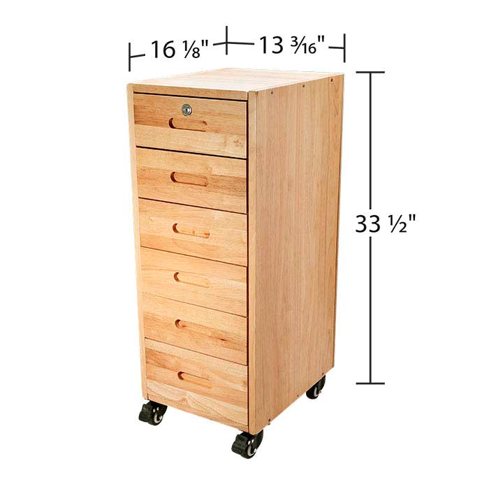 Expand your storage capacity and conveniently organize tools and supplies with this exclusive Rio Grande wood drawer stack. The unit features six drawers and four swivel casters that make it easy to move; the front casters lock in place, ensuring the unit does not move unexpectedly. The top drawer locks, proving security. This six-drawer unit perfectly matches our Rio jeweler's workbench (available separately), or can be used as a stand-alone piece in any work area. Crafted almost exclusively from rubberwood; the drawer sides and bottoms are made from medium- to high-density fiberboard. The drawer stack arrives assembled with casters in place.