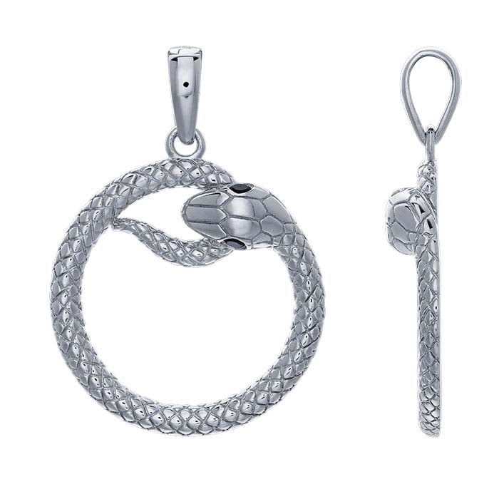 This sterling silver pendant features a detailed ouroboros set with two black 1.5mm CZs as the eyes. Ouroboros is an ancient Egyptian symbol that shows a snake or dragon consuming itself, tail-first, creating a circle that represents the cyclical nature of life. The pendant is plated with rhodium to ensure a durable, tarnish-resistant finish. It includes a smooth, tapered bail.