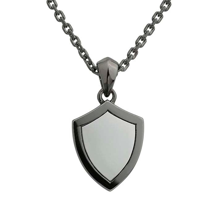 This sterling silver necklace features a two-tone look with a shield pendant suspended from a black rhodium-plated chain. The 29.5 x 16mm pendant presents a bright, mirror-finished center that contrasts nicely against its black rhodium-plated polished edges—the center is engravable. The bail is fixed and features a peaked, tapered profile. The back of the pendant and the bail match the black, rhodium-plated polished edges shown on the front. The 2.1mm beveled oval cable chain includes a 2" chain extender and an oval quality tag. This necklace is ready to wear, ready to sell!