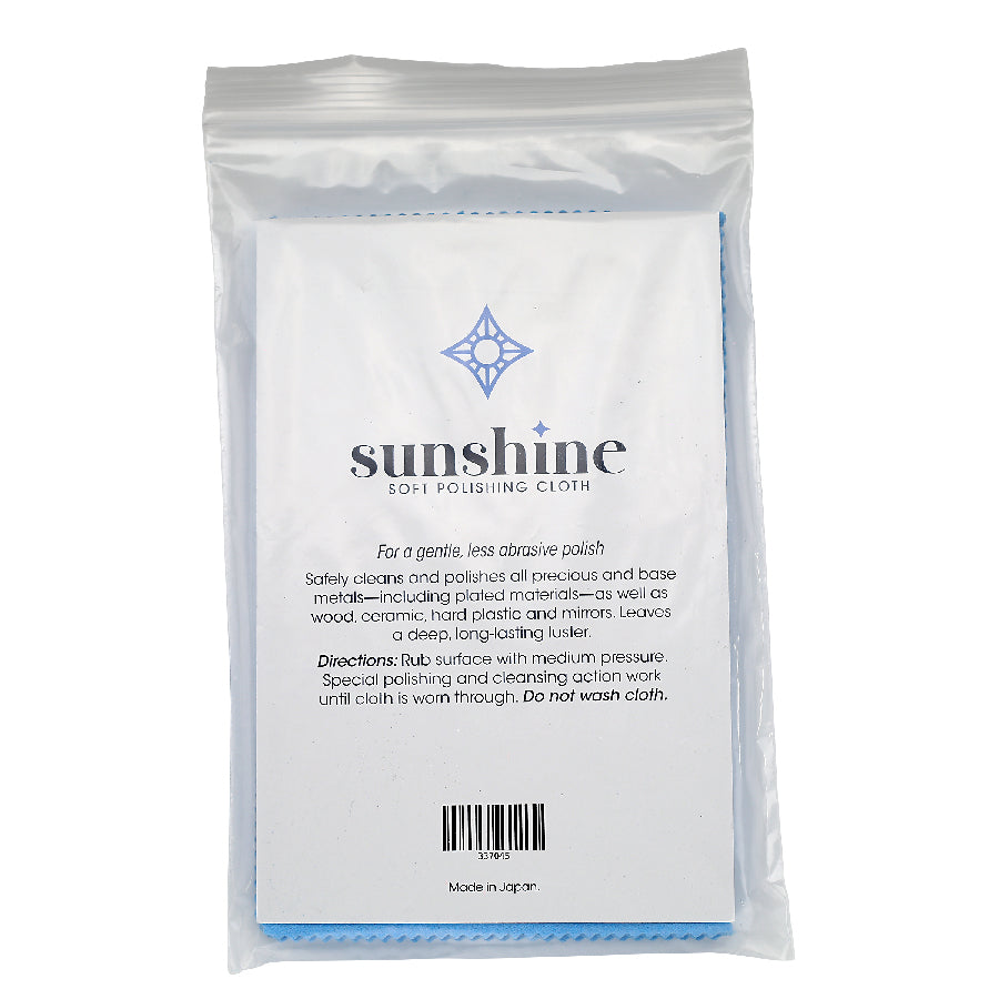 Get a high shine with Sunshine® Soft blue polishing cloth, impregnated with a gentle micro-abrasive that's less aggressive than our original yellow Sunshine Cloth. Ideal for gold-filled pieces, and safe for precious metals, base metals, glass, wood, hard plastic, ceramic and mirrors. The long-lasting cloth keeps effectively polishing until it is worn through. Made exclusively for Rio Grande, to save you time and deliver a beautiful polish. Each resealable plastic bag contains 10 cloths, perfect for gifts with purchase.