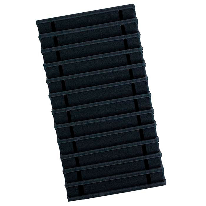 This full-size tray insert is ideal for displaying and transporting bracelets or watches; raised dividers create 12 compartments that keep your jewelry separated to better show them and to prevent damage from jumbling together. The dividers are 1" apart and accommodate bracelets or watches up to 7" long; elastic bands secure the jewelry in place. Black velvet covers the sturdy medium-density fiberboard (MDF) insert; the insert fits into full-size trays.
