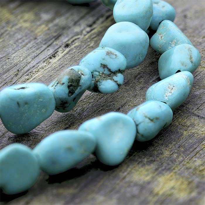 The irregularly shaped Chinese turquoise nugget beads on this strand feature a sky-blue to greenish color with a dark matrix—each bead has a varying amount of matrix, giving the strand a one-of-a-kind look. The nuggets look great when strung on their own in a necklace or bracelet, used individually as accent beads or when combined with complementary-color beads in necklace, earring and bracelet designs—turquoise looks especially good with silver beads and findings. Sourced from China, this turquoise features green/blue color and displays quite a bit of matrix, which gives each stone significant contrast and unique patterning.Turquoise is a soft, opaque gemstone that takes a good polish. Its sky blue color comes from the presence of copper; green tones are provided by iron traces. Turquoise sometimes has a rock matrix and varying shades of gray, brown or black veining due to inclusions or oxide stains.Ready to string, each package contains one temporarily strung 15"–16" strand.