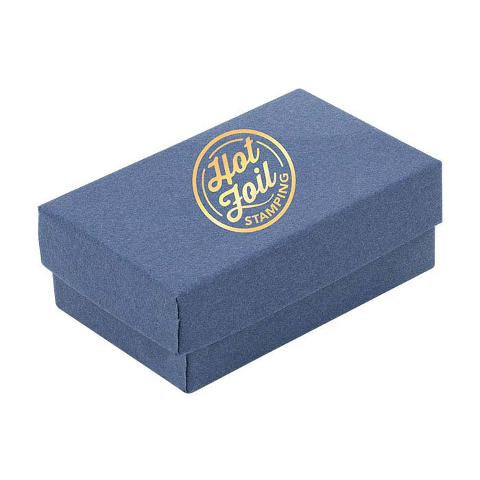This paper-covered, two-part universal box accommodates a variety of jewelry styles. Use the box as-is, or mix & match it with solid-color cardboard boxes to create color combinations to suit your brand, for seasonal packaging, or for special occasions. Add a decorative ribbon, gift wrapping, or bow (available separately) to customize each box. Navy blue recycled paper (100% post-consumer fiber) covers the 100% recycled cardboard box (made with 90% post-consumer fiber and 10% pre-consumer fiber); the box includes a 1/2"-thick white poly-fill wadding that will not cause tarnish.Hot stamp your gift box with your company name or logo, keeping you top-of-mind long after the jewelry sale.